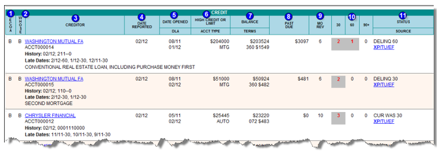 3. Creditor This shows the name of the creditor that the borrower has an account with, as well as the Account Number beneath it. Beneath the account number is the History field which details the Late Days field tells you the dates of late payments and the number of days they were past due. 1Credit Report Legend